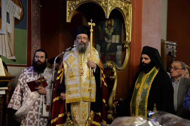 Ἐντός τοῦ Ἱεροῦ Βήματος συμπροσηύχετο ὁ Σεβασμιώτατος, ὁ ὁποῖος στό τέλος εὐχήθηκε στό πολυπληθές ἐκκλησίασμα ἒτη πολλά καί εὐλογημένα καί εὐχαρίστησε καὶ ἐπήνεσε τὸν Ἐφημέριο τοῦ Ἱεροῦ Ναοῦ, πανοσιολογιώτατο Ἀρχιμ. π. Γαβριὴλ Χριστόπουλο, ὃλους τοὺς Ἱερεῖς καὶ τοὺς Διακόνους ποῦ τελοῦν τὶς καθημερινὲς Ἱερὲς Ἀκολουθίες, ὡς καὶ ὃλους τούς εὐσεβεῖς Χριστιανούς, γιὰ τὸν ζῆλο καὶ τὴν ἀφοσίωσή τους στὴν Ἁγία μας Ἐκκλησία.