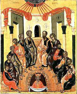 Η εικόνα της Πεντηκοστής παρουσιάζει υπερώο. Είναι το υπερώο που έμεναν οι Απόστολοι μετά την Ανάληψη του Κυρίου. Οι Απόστολοι κάθονται ημικυκλικά. Στην κορυφή του ημικύκλιου είναι οι Πρωτοκορυφαίοι Απόστολοι Πέτρος και Παύλος. Τρίτος δεξιά του Πέτρου είναι ο Απόστολος και Ευαγγελιστής Λουκάς και απέναντι του ο Απόστολος και Ευαγγελιστής Μάρκος, τρίτος κοντά στον Παύλο. Ακολουθούν οι υπόλοιποι Απόστολοι κατά σειράν ηλικίας. Όλοι είναι ήρεμοι με γλυκεία έκφραση και στοχαστικό βλέμμα. Κρατούν ειλητάρια έκτος του Αποστόλου Παύλου, που κρατεί βιβλίο. Είναι τα σύμβολα του διδακτικού χαρίσματος, που έλαβαν από το Άγιο Πνεύμα. Μεταξύ των Πρωτοκορυφαίων διακρίνεται ένα κάθισμα κενό. Είναι η θέση του Χριστού, της θείας Κεφαλής της Εκκλησίας, την οποίαν εικονίζει η εικόνα της Πεντηκοστής.
