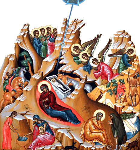 Προκαταβολικά πρέπει να σημειώσουμε, ότι η εικόνα της Γεννήσεως του Χριστού ανήκει στις λεγόμενες πολυεικόνες, διότι απεικονίζει πολλά γεγονότα μαζί, που χρονικά και τοπικά απέχουν μεταξύ τους. Είναι και αυτός ένας τρόπος που χρησιμοποιείται από την Εκκλησία μας, για ναπαρουσιάζει και να βιώνει το γεγονός της θείας ενανθρωπήσεως, ως ένα συνεχές παρόν.