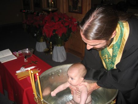 Ὁ ἱερεύς: «Βαπτίζεται ὁ δοῦλος / ἡ δούλη τοῦ Θεοῦ (…) εἰς τὸ ὄνομα τοῦ Πατρός»· καὶ συγχρόνως βυθίζει τὸν βαπτιζόμενο στὸ ἁγιασμένο νερό.