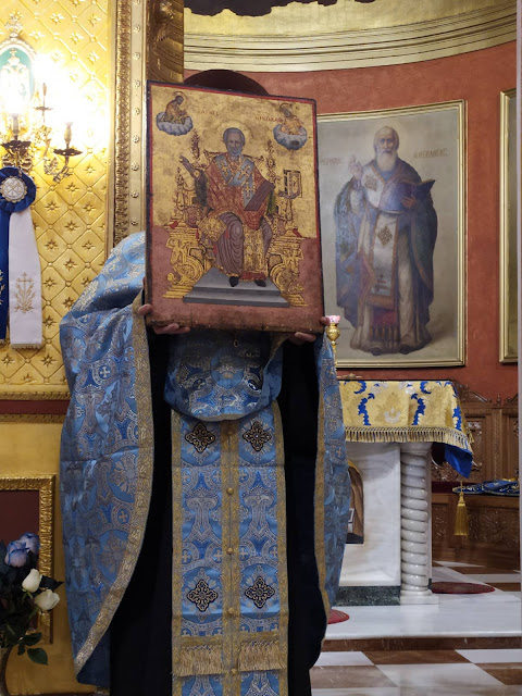 Ἀνήμερα, ἐχοροστάτησε στόν Ὂρθρο καί ἐτέλεσε τήν Θεία Λειτουργία ὁ Σεβασμιώτατος Μητροπολίτης Πατρῶν κ.κ. Χρυσόστομος, ὁ ὁποῖος ὡμίλησε γιά τήν χάριν παρά Θεοῦ, τήν ὁποίαν πλησίον εἶχε ὁ μέγας Ἱεράρχης τῶν Μυρέων, θαυματουργῶν καί ἐν ὃσῳ εὑρίσκετο εἰς τόν κόσμον αὐτόν, ἀλλά καί μετά τήν κοίμησή του. Φοβερά εἶναι τά σημεῖα πού ἐπιτελοῦνται, ἐσημείωσε ὁ Σεβασμιώτατος διά πρεσβειῶν τοῦ Ἁγίου, τῶν ὁποίων μάρτυρες εἶναι πλεῖστοι ὃσοι, ἐν οἷς καί ὁ ὁμιλῶν, ὁ ὁποῖος κατά τήν μεγίστην οἰκονομίαν τοῦ Θεοῦ, διηκόνησε ἐπί 25 ἒτη τόν Ἃγιο Νικόλαο, ὡς Μοναχός καί Ἡγούμενος στήν Ἱερά Μονή του, τῶν Βαρσῶν τῆς Τριπόλεως.